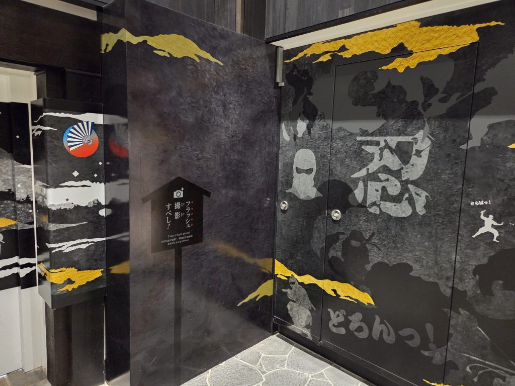 ショップの奥にある食糧庫の部分には忍者の秘話がかかれている漫画コーナーがありました。その一角に不思議な壁かあり、普通に写真を撮るとこんな感じですが、フラッシュを使って写真を撮るとちょっと面白いものが映し出されました。ぜひフラッシュを使って撮影してみてください。