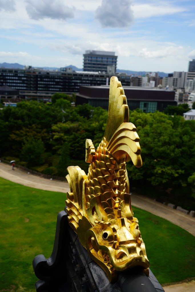 1階を見てから、エレベーターで最上階へと上がり、階段で下りつつ資料を見て回りました。最上階で外に出ることはできませんが窓からしゃちほこを見ることができました。そして屋根に飾ってあるしゃちほこと同じものが城内に飾られており、しゃちほこと一緒に写真を撮れるようになっていました。最上階だけ冷房の効きが悪くて、ざっと見て下階に下りてしまう人も多かったですが、最上階にある立体的なマップに映像が映し出される展示コーナーは当時の歴史や文化をわかりやすく紹介していたので見て良かったです。